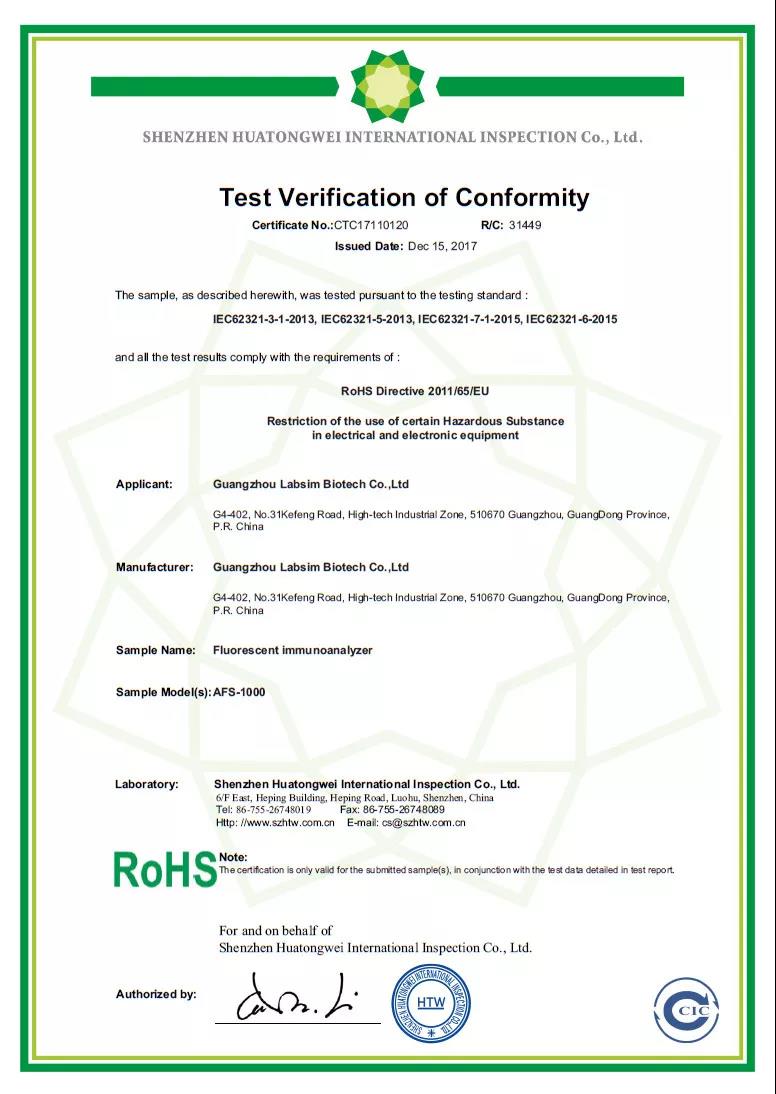 廣州藍勃榦式熒光免疫層析分析儀AFS-1000通過RoHS檢測