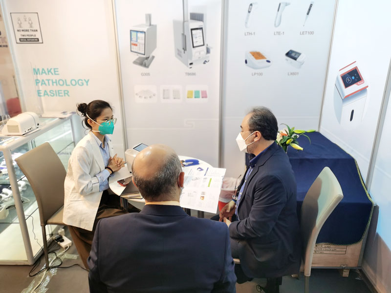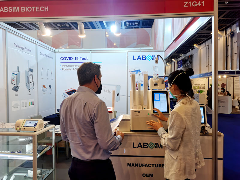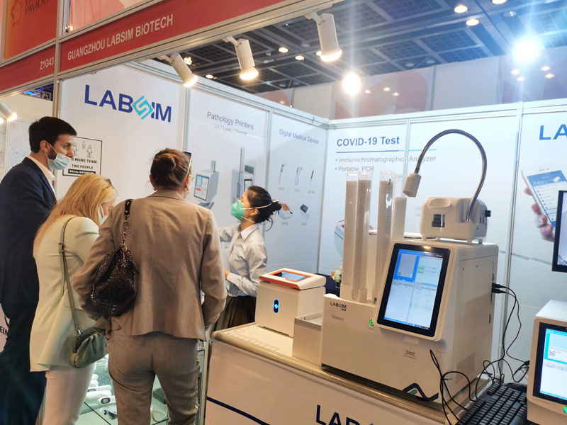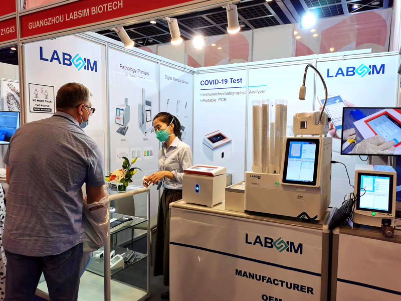 本屆展會上藍勃生物攜榦式熒光免疫分析儀AFS-1000、手持式榦式熒光免疫分析儀AFS430、膠體金免疫層析分析儀AGS1000,與組織盒激光打號機TB586UV、載玻片熱轉印打號機G304等明星産品亮相,展會現場吸引了大批觀衆前來溝通交流。